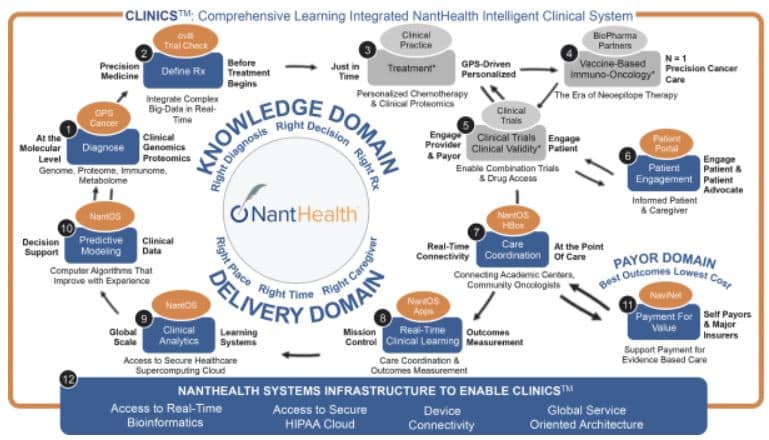The first step involves comparing the patient’s genetic profile to nearly 13,000 active clinical trials updated weekly and over 2,500 evidence-based treatment regimens for the treatment of cancer which are made available through a platform they call “eviti” which 75% of all oncology practices in the United States have used. Once a personalized treatment regime is defined, they can then identify a treatment provider from the approximately 450 revenue-generating clients that access the platform. Payments are handled through their “payor” which handles 30 million monthly payer-provider transactions. Their “clinical operating system” called NantOs provides the connectivity needed to collect and centralize all this “big data” while making it accessible to all parties: