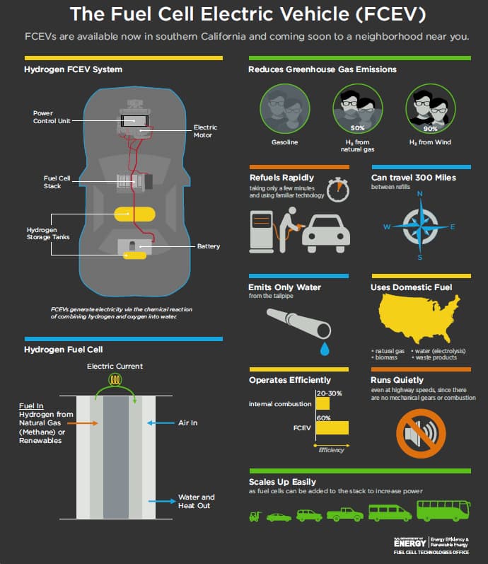 You may recall from high school science class (when you weren’t skipping to smoke cigarettes before gym class) that fuel cells (at least the ones we’re talking about here) is a type of technology that uses compressed hydrogen and air to produce clean electricity. The most common type of fuel cell for vehicle applications is the polymer electrolyte membrane fuel cell. You can look at the graph below for an illustration of the technology or geek out further over the details from the Department of Energy.