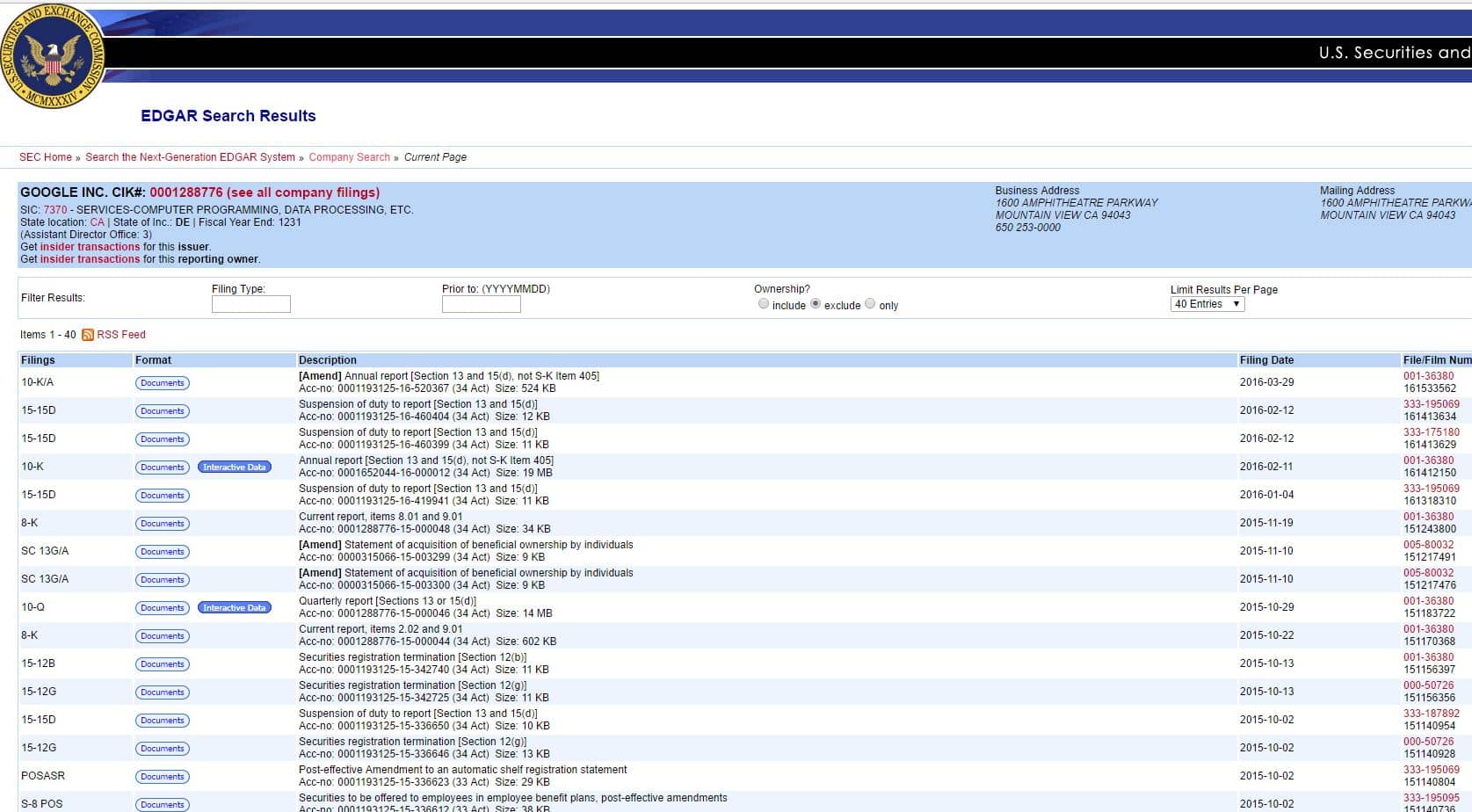 Using this data to make trades would be referred to as “technical trading” because it ignores the fundamentals behind stocks. People that do technical trading are often thought of as speculators by investors who invest based on fundamental data, things like profitability, revenues, valuations, etc. All of the fundamental data for every publicly traded stock on a major exchange is contained in regulatory flings which most people don’t see, but that is accessible using online tools. These are the tools we use to expose over-the-counter (OTC) companies that are misleading investors. The only problem we’ve found is that it takes a lot of time to dig through the data. Here’s what the interface for the SEC online filing system looks like: