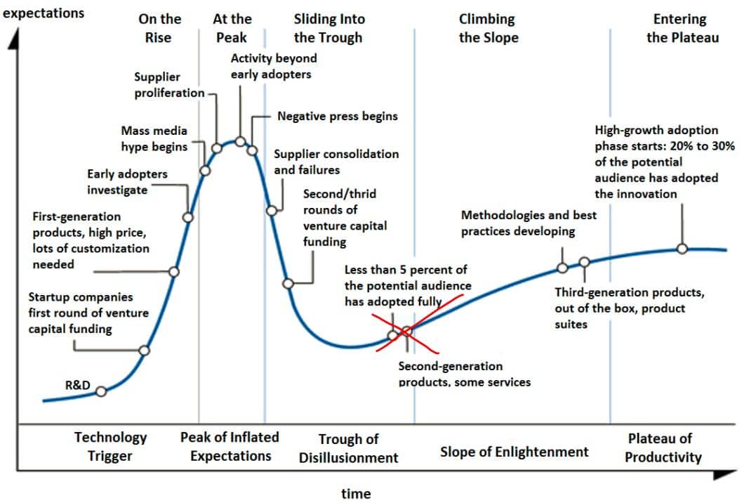The drop in sales was blamed on “weak investment in capital equipment by customers within key verticals, as well as difficult macroeconomic conditions in certain global regions” which makes little sense if, in fact, 3D printing is the panacea to that old bulky method of traditional manufacturing. The real explanation can probably be found somewhere in the Gartner Hype Cycle where we can see that we’re now starting to ascend the slope of enlightenment as seen below: