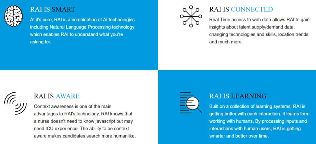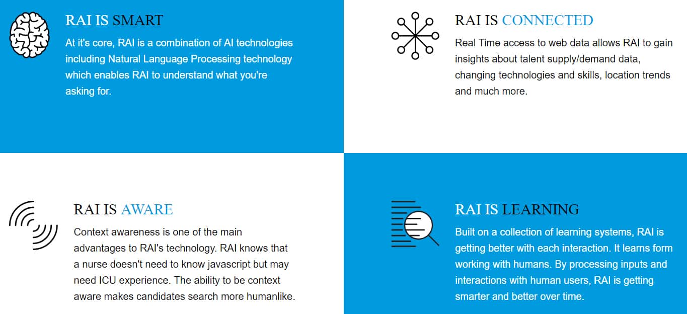 Mya meet RAI, the AI recruiting assistant from Chandler, Arizona startup HiringSolved. The company has taken in $4.5 million to date, including a $3.5 million Seed round two years ago this month. Calling itself “Google for Talent”, HiringSolved recently developed RAI (Recruiting Artificial Intelligence), what the company has called Siri for recruiting. (As you can tell, HiringSolved likes its analogies.) Like Mya (short for my assistant), RAI uses NLP to keep conversation casual and engaging with recruiters scouting new talent. RAI is predicated on HiringSolved’s Google-like TalentFeed search engine.