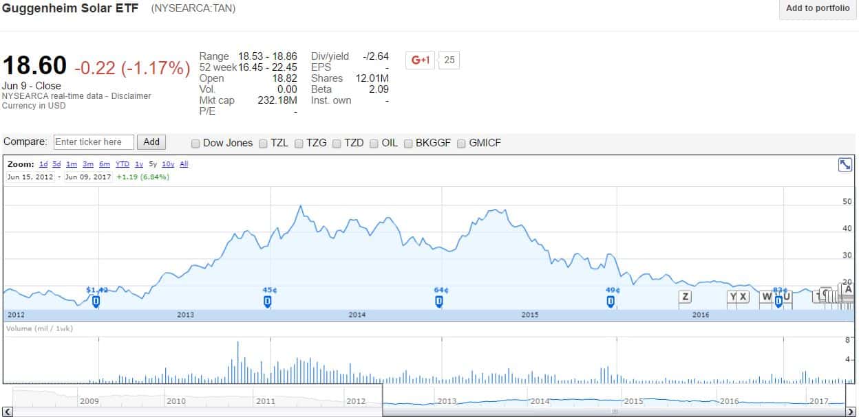 Solar is in a peculiar position right now. While it’s an incredibly promising segment of the energy sector, short-term outlook is clouded by oversupply, dropping margins and a grim 2017 with governments axing installation incentives and the US withdrawing from the Paris Agreement. These circumstances have caused investment sentiment to turn bearish in Q4 2016 and market perception hasn’t changed since. This concerns us because we’ve been invested in the Guggenheim Solar ETF (NYSEARCA:TAN) for about 5 years now and these are the sort of rubbish returns we’ve realized: