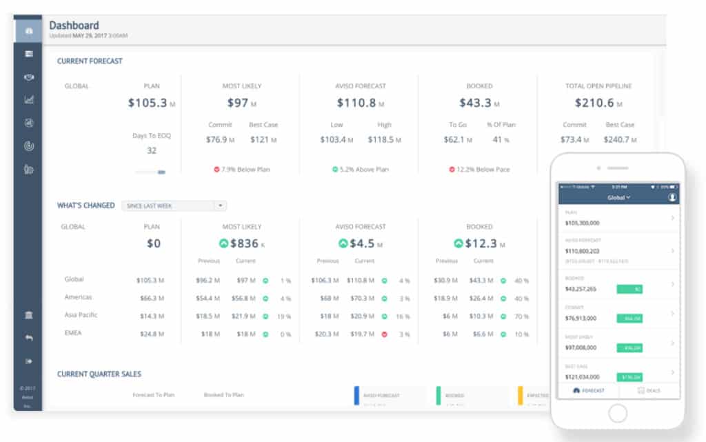 Click for company websiteAviso in Silicon Valley aims to assist executives with powerful AI to better determine risk and accurately forecast sales. Its total funding is now $31 million, following a recent $8 million round led by investors NextWorld Capital, Scale Venture Partners, and Shasta Ventures. The SaaS company has a new CEO, Michael Lock, formerly of Google Enterprise, while co-founder and former CEO K.V. Rao has moved to chief strategy officer. Rao and co-founder Andrew Abrahams started Aviso with the goal to move financial analysis and planning beyond the spreadsheet to a bigger-picture, predictive analytics tool, like the one below.