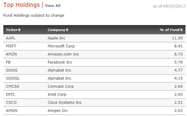 We’re almost three quarters of the way through the year now and the bull is still charging. Since our focus is on investing in emerging technologies, we can use the NASDAQ 100 Index (the top 100 companies traded on the NASDAQ exchange) as a benchmark for tech stocks. There is a popular exchange traded fund (ETF) that tracks the NASDAQ 100 called the PowerShares QQQ Trust or QQQ. It’s one of the biggest and most traded ETFs in the world, and it’s up +20.5% this year. The ETF is heavily weighted towards technology with the following 9 technology stocks accounting for more than 50% of QQQ’s weight.