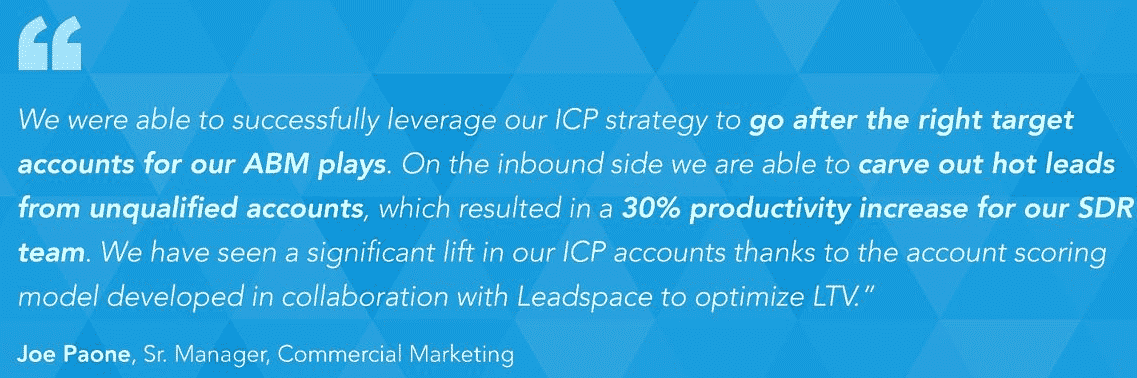 We’re not sure if it’s humanly possible to cram and more acronyms into such a short message, but the key takeaway here is that their SDRs ( Sales Development Reps) were 30% more productive by using Leadspace’s tool and sold more isht than before.