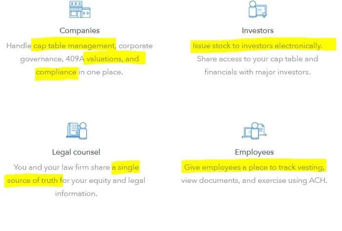 You can see the various services that eShares can provide each stakeholder above and can probably imagine how much little time and desire founders have to deal with this stuff while they’re busy executing with a laser focus. It’s no surprise that over 6,000 startups use the eShares service including names like Kickstarter, Squarespace, and Cylance. The product is sold as a SaaS offering, so expect a subscription model. You’ll need to ask them about pricing because it’s only available upon request.
