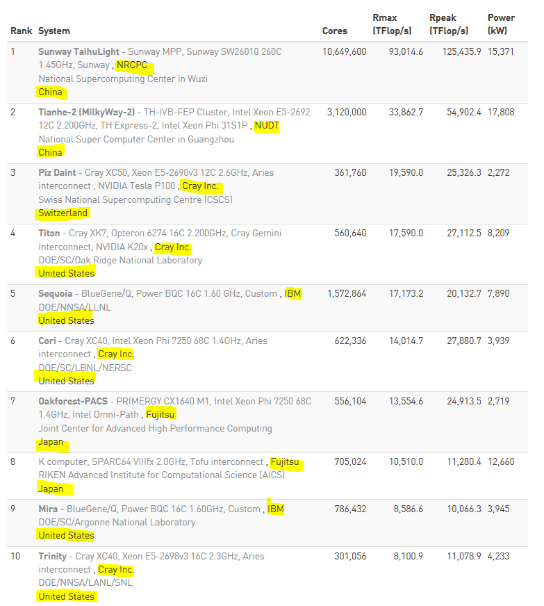 In third place we see the Sunway TaihuLight (NRCPC is the supercomputing center where this monster lives) and in first place we see none other than Cray Inc. (NASDAQ:CRAY). Second place is HPE which stands for Hewlett-Packard (NYSE:HPE). Along with other familiar names on the list are some outfits you may never have heard of: