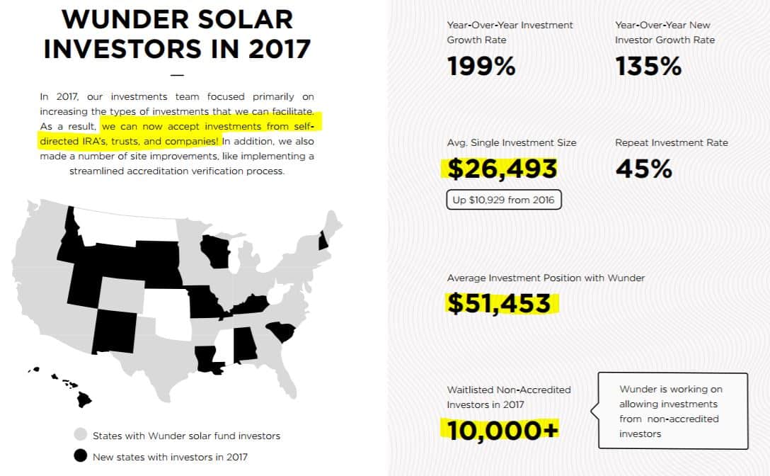 The first thing to note here is that they’ve forgotten about the Alaskans (cue outrage tweets). The second thing to note is that accredited investors don’t appear to be taking advantage of the $1,000 minimums since the average investment position sits at around $51,000. The third thing to note is that there is a great deal of interest from non-accredited investors who would be likely to invest in smaller amounts making the platform “$1,000 minimum” quite appealing. A cursory look at another firm out there called SunFunder which provides solar financing shows minimums of around $100,000 which makes them off limits to the majority of retail investors.