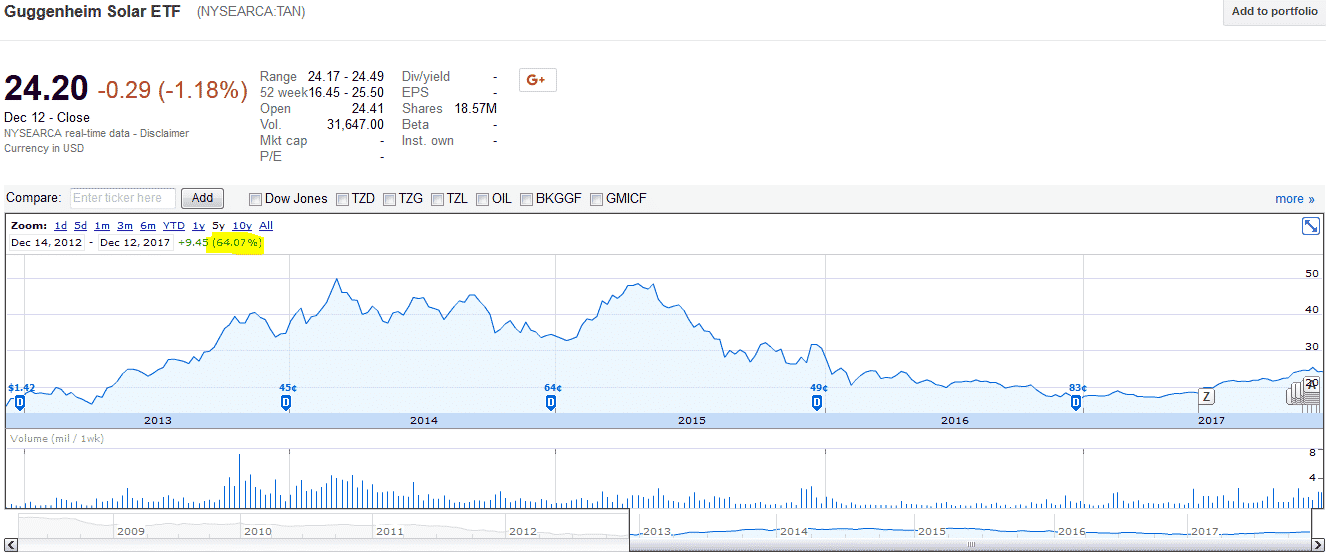 That’s not even taking into account commercial installations that cover large areas and can power factories, schools, hospitals, and all of Mr. Musk’s silent and extremely fast electric vehicles. As investors, we have believed in the potential of solar for a long time and consequently have been holding the Guggenheim Solar ETF (NYSEARCA:TAN) for quite a while now. Here’s how that investment had performed over the past 5 years: