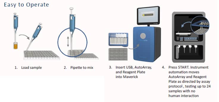 Genalyte out of San Diego is the most likely heir apparent. Founded in 2007, the company has raised about $91.8 million in disclosed funding for its Maverick Detection System. Its backers include top venture capital firms like Khosla Ventures. TechCrunch had reported that the Maverick Detection System can run up to 128 different tests on a single finger prick of blood in under 15 minutes. We didn’t immediately find anything on the company’s website to substantiate that claim, only that the Maverick Detection System uses silicon photonic biosensors to perform multiple tests off a single drop of whole blood in 15 minutes. The platform is built around a disposable array that contains 12 of these silicon chips that can detect in real-time when proteins or antibodies bind to the sensors.