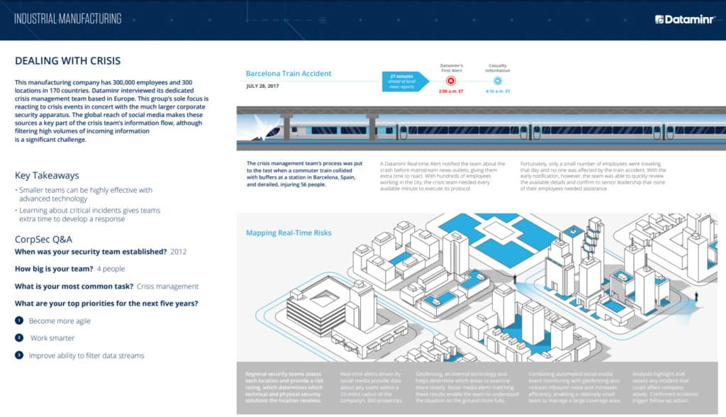 In a real-life example from a few years ago, a gas explosion in New York City’s East Village caused a massive blaze that killed two people and injured a couple dozen others. Dataminr sent its first alert about the disaster about 12 minutes ahead of major news reports and helped emergency responders get to the scene that much quicker.