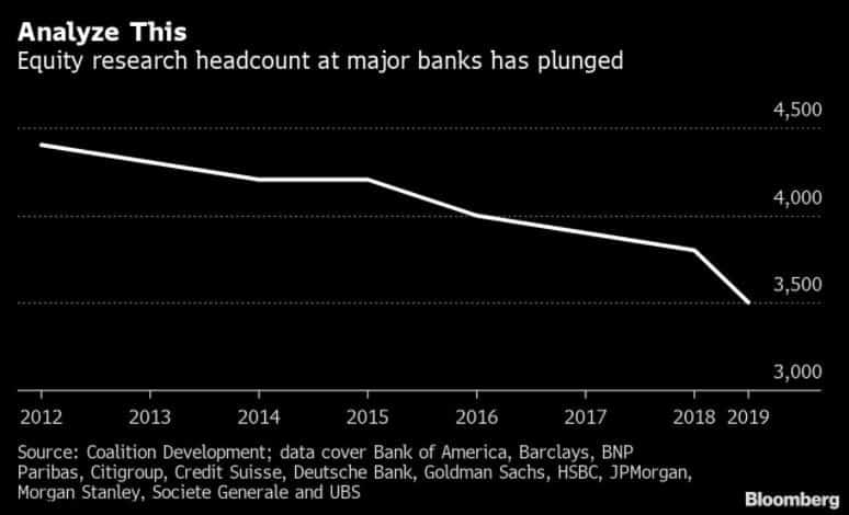There’s been an ongoing debate around the merits of paid research reports. Back in 2014, IR published a piece titled “Should You Pay for Equity Research?” which talked about how “Sell-side cutbacks have left more companies contemplating issuer-sponsored equity research. But not all providers are equal.” The below chart by Bloomberg shows how equity research headcount at major banks has been plunging over the years.
