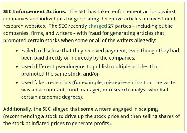 We’ve filed complaints before with the U.S. Securities and Exchange Commission (SEC) that fell on deaf ears, so we’re less than impressed with their ability to police all the bad men out there. Still, we listen when the SEC issues warning and/or takes action because it’s probably just the tip of the iceberg. In April of 2017, the SEC published an investor alert titled “Beware of Stock Recommendations on Investment Research Websites” which warns investors that “seemingly independent commentary on investment research websites may in fact be part of paid stock promotion campaigns.” From the alert: