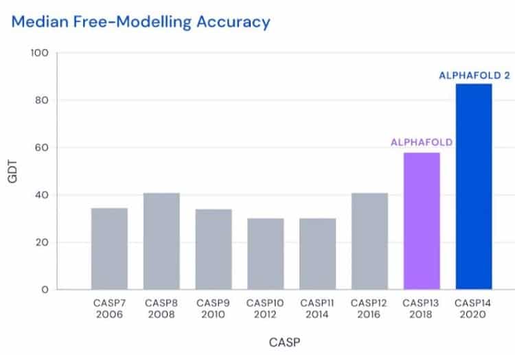 Scientists have been on a five-decade quest to computationally predict a protein’s 3D structure based solely on its 1D amino acid sequence. The big news today was that DeepMind’s algorithm, AlphaFold, now achieved a level of accuracy that wasn’t expected until decades from now. What happened today is being lauded as a breakthrough that will fundamentally change biological research going forward.