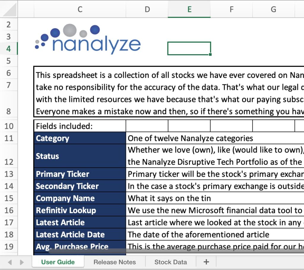 The Nanalyze Disruptive Tech Stock Catalog, available to annual subscribers, is an Excel catalog of the ~400 stocks and ETFs we cover.